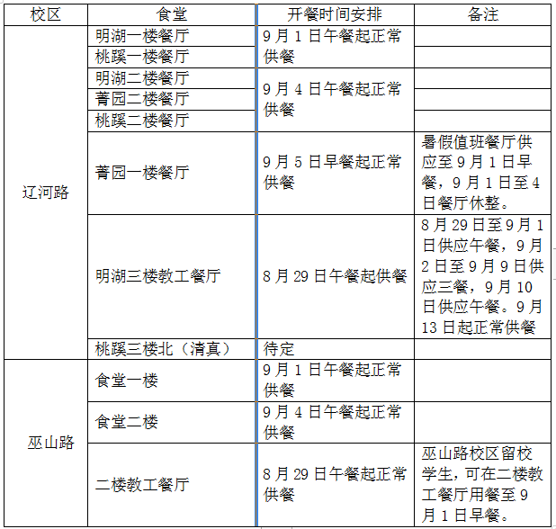 备注:9月10日前教工餐厅早餐7:30-8:30,午餐11:00-12:30,晚餐17:00-18:00,9月13日起恢复正常。
